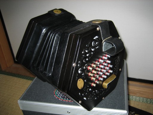 つい1週間前からなんですが、ずーと前からの念願であったコンセルティーナ(Concertina)という楽器をいじり始めています。コンセルティーナは日本では英語名コンサーティーナとして知られており、イギリス、フランス、ドイツで1820年代に同時発生的に広まったボタン式アコーディオンの一種(下の写真参照)。大きさはとても小さく、タンゴで使うバンドネオンの3分の1くらい、両手に収まる感じの可愛らしい楽器です。この機会にいろいろ調べたのですが、なんと現在の鍵盤式アコーディオン(20世紀初頭発明)やボタン式バンドネオン(1835年頃発明)よりもさらに古い、いわゆる蛇腹を閉開しながら弾くリード楽器の元祖らしいです。