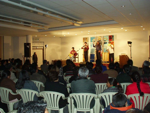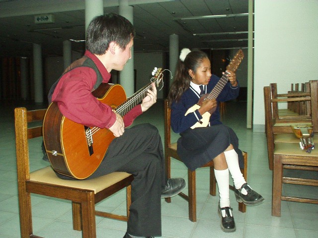 ラパスに来てはや3週間になろうとしています。平日やっている新作CDの仕事もルーズな「ボリビア時間」からすれば(笑)、思ったより快調です。その他、先週の4月1日(金)にはダビー・ポルティージョ(歌手)さんとの前作「天地逆転」をテーマにオルーロ市立文化会館でコンサートをして来ました。2人のほか、サポートメンバーにカルロス・ポンセ(サンポーニャ)とファン・カルロス・コルデーロ(ギター)を迎えた最高にして最強のクアルテット!、またオルーロ市役所や各テレビ局などが後援してくれたおかげで会場は200人以上の満員、立ち見の方も見うけられるほどの盛り上がりとなりました。カピタル・デ・フォルクローレ(民俗文化のメッカ)とも称されるオルーロ市はラパスからバスで3時間のところにあり南米でも有数規模のカーニバルで有名な街なのですが、普段は思ったよりも文化行事が少ないと市民の人達は嘆いています。でも彼の地でのお客さんの熱っぽさには感動しました。本当に演奏者冥利につきるものでした。ひとつ印象的だったのは、コンサート途中の休憩時間に、チャランゴを習っているという10歳の女の子がお母さんと楽屋に訪ねてくれたので、その場で僕のギターと一緒に合奏したことです(下の写真)。学校の制服のままで来てくれた彼女のチャランゴは見事な腕前でした。確かに表向けの「文化行事」そのものはあまり盛んでないのかも知れませんが、沢山の若い才能が花開いていることを垣間見た嬉しい出来事でした。