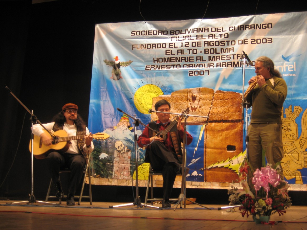 この7月23日(月)〜27日(金)までボリビア共和国エルアルト市で開催された「第6回国際チャランゴフェスティバル(Encuentro Inrternacional del CHARANGO)」が無事終わりました。日本からは私の他に植月佳奈、桑原健一、鈴木龍の各氏が参加、その他、ボリビア国内からはもちろん、アルゼンチン、チリ、メキシコ、フランスなど世界中からプロ・アマ、老若男女問わずチャランゴ奏者や製作家たちが数多く集まり、標高4000mの冬のアンデス高地にもかかわらず、連夜のコンサート、チャランゴ展示会、講演会などでおおいに盛り上がりました。