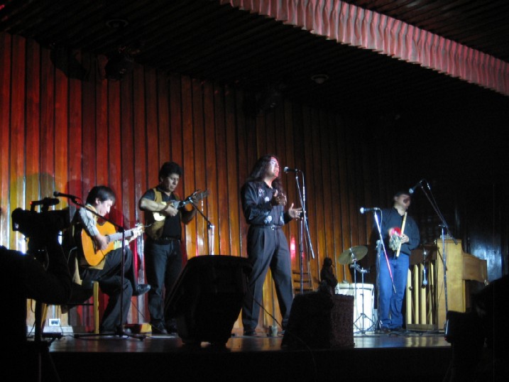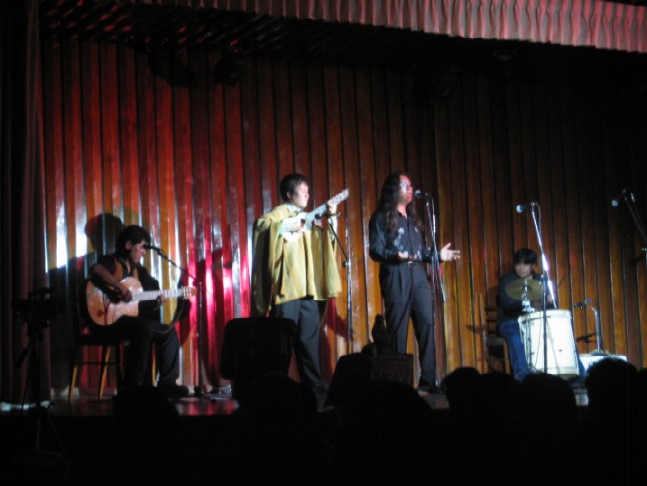 コンサートは僕、ダビー氏のほかに、カルロス・ポンセ(サンポーニャ)、アレハンドロ・アラルコン(ケーナ&サンポーニャ)、ダニーロ・ロハス(ピアノ)、ファン・カルロス・コルデロ(ギター)といった錚々たるマエストロらに加え、ゲストに現在1年間のチャランゴ留学中である神戸出身の安達満里子さんも熱演、初の試みながら舞台脇の5メートルのスクリーン(プラス3台のカメラ!)の効果も手伝って、200人で超満員のお客さんとともに盛り上がりました。1ヶ月という短い滞在期間中にこのような機会を与えてもらって感激でした。同時に、自分は「ボリビアの」音楽家でもあり続けなければいけない、という心地よい責任感を改めて感じた夜となりました。